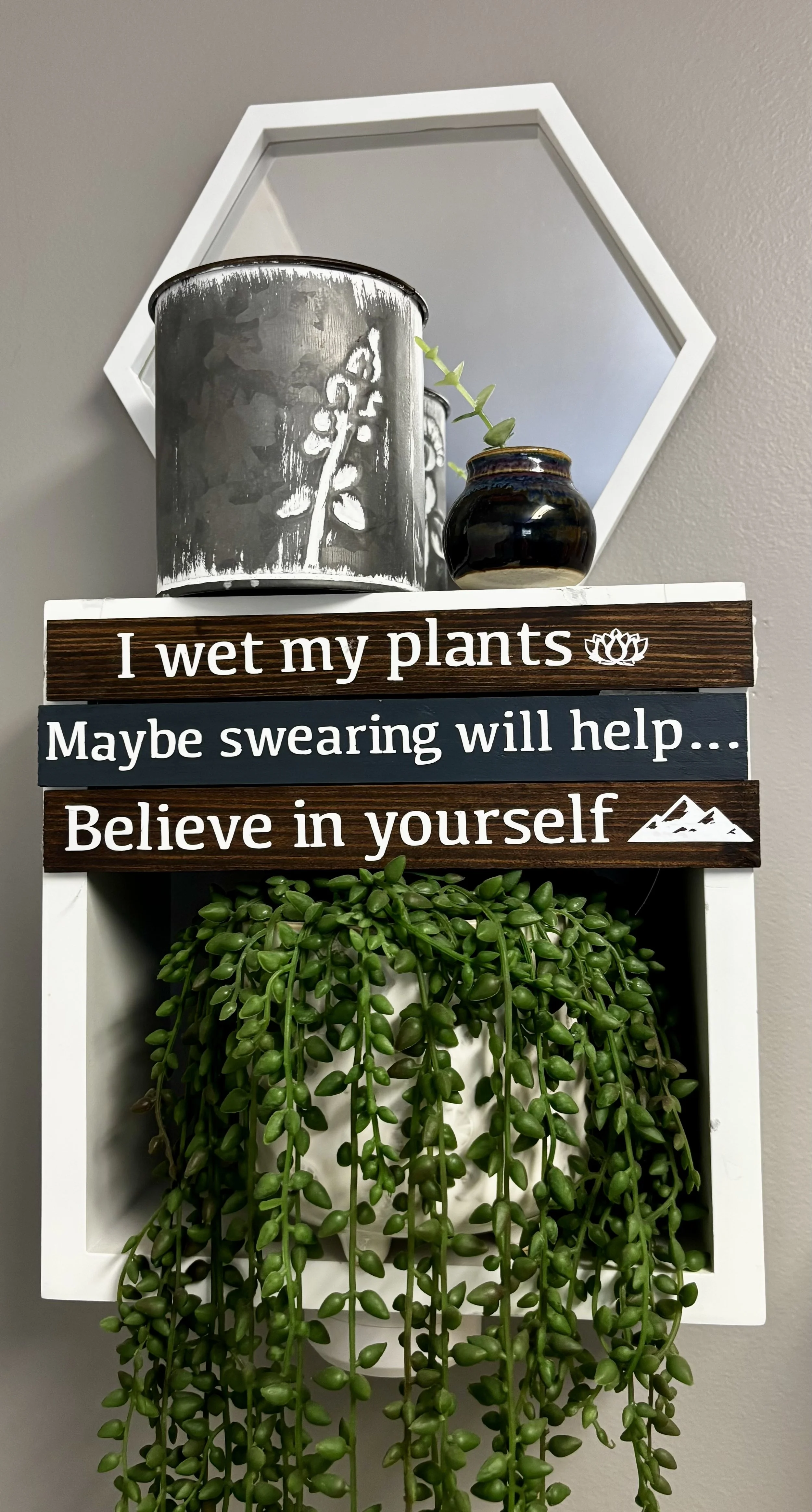 Stained wood with a clever message. 11”x1”. Lightweight and easy to settle on various surfaces around your home or office.